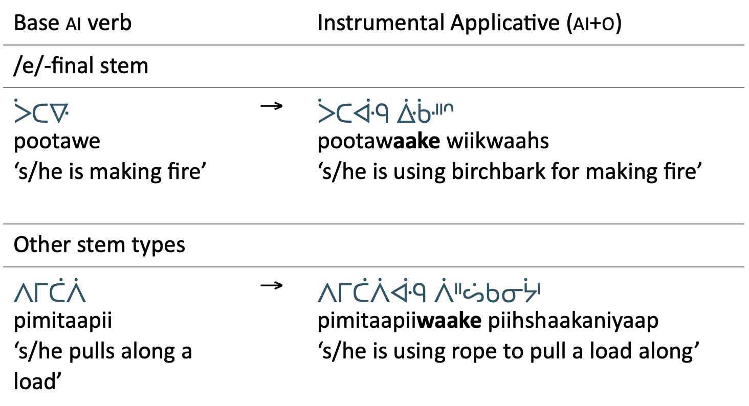 This paper presents the first full description of a dedicated instrumental applicative in Ojibwe, first noted by Todd (1970: 188). The instrumental suffix -(w)aake adds a secondary object to an ai verb, producing a new ai+o verb that means ‘use it for Ving’.