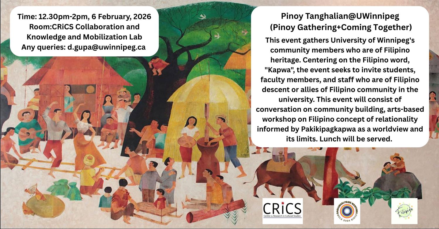 This event gathers University of Winnipeg's community members who are of Filipino heritage. Centering on the Filipino word, "Kapwa", the event seeks to invite students, faculty members, and staff who are of Filipino descent or allies of Filipino community in the university. This event will consist of conversation on community building, arts-based workshop on Filipino concept of relationality informed by Pakikipagkapwa as a worldview and its limits. Lunch will be served.
