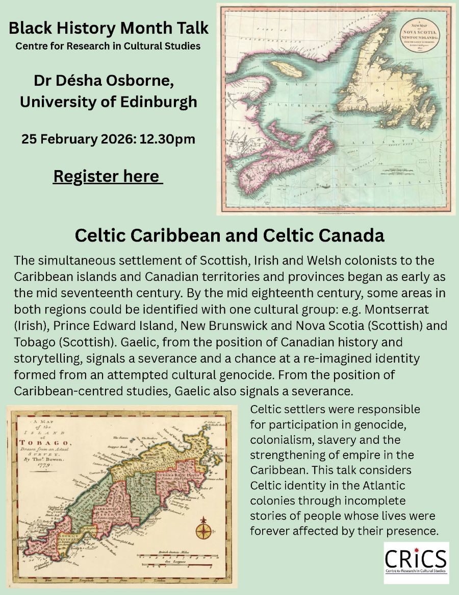 CRiCS hosted a public, virtual lecture on Celtic Caribbean and Celtic Canada by Dr Désha Osborne, Lecturer and Chancellor’s Fellow at the University of Edinburgh on 23 February, 12.30pm CST.