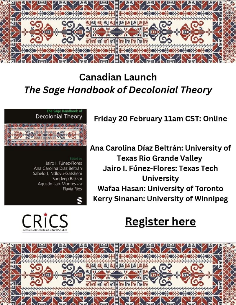 The Centre for Research in Cultural Studies at the University of Winnipeg is pleased to host the Canadian virtual launch of The Sage Handbook of Decolonial Theory (2024), edited by Jairo I. Fúnez-Flores, Sabelo Ndlovu-Gatsheni, Ana Carolina Díaz Beltrán, Sandeep Bakshi, Augustin Lao-Montes, and Flavia Rios.