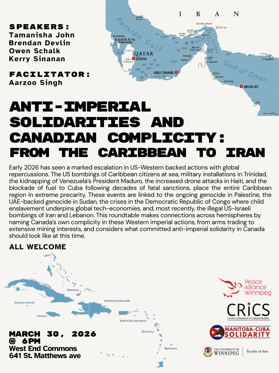Early 2026 has seen a marked escalation in US-Western backed actions with global repurcussions. The US bombings of Caribbean citizens at sea, military installations in Trinidad, the kidnapping of Venezuela's President Maduro, the increased drone attacks in Haiti, and the bloackade of fuel to Cuba following decades of fatal sanctions, place the entire Caribbean region in extreme precarity. These events are linked to the ongoing genocide in Palestine, the UAE-backed genocide in Sudan, the crises in the Democratic Republic of Congo where child enslavement underpins global tech-economies, and, most recently, the illegal US-Israeli bombings of Iran and Lebanon. This roundtable makes connections across hemispheres by naming Canada's own complicity in these Western imperial actions, from arms trading to extensive mining interests, and considers what committed anti-imperial solidarity in Canada should look like at this time.