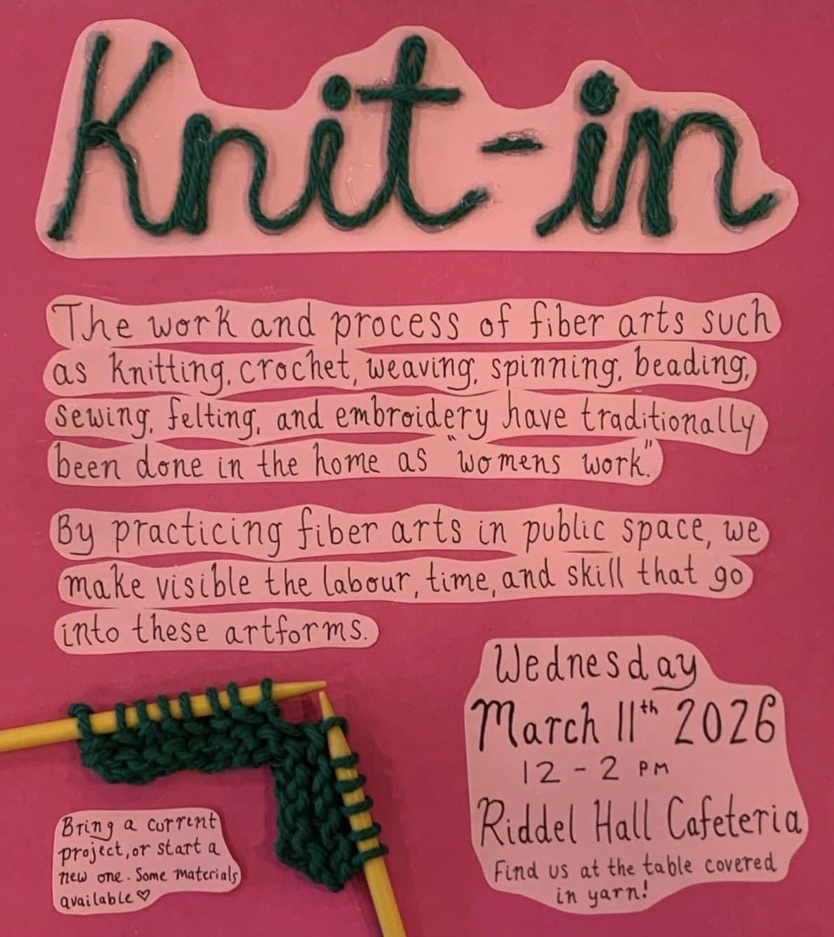 By practicing fiber arts in public space, we make visible the labour, time, and skill that go into these artforms.
